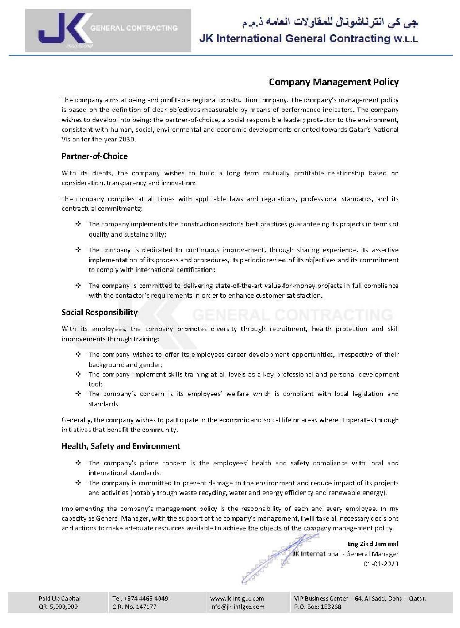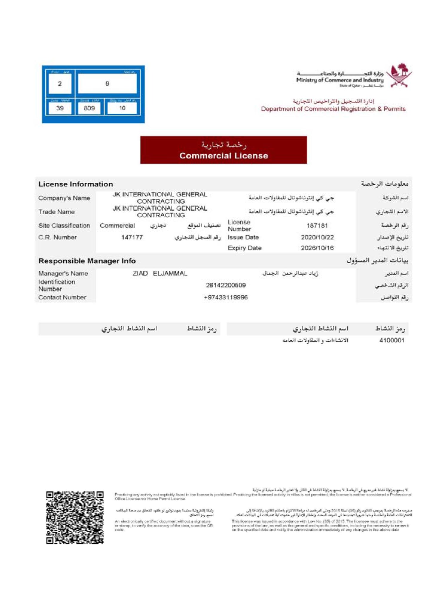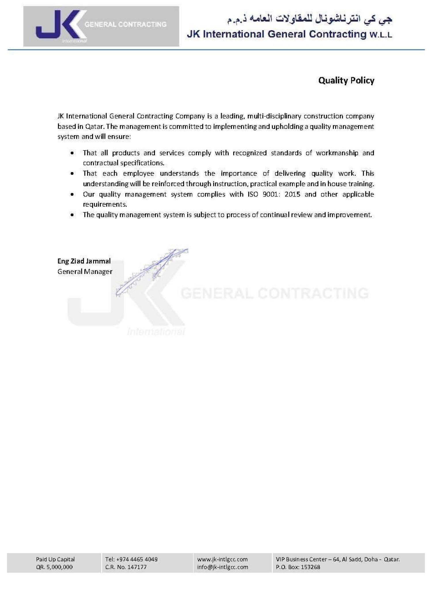 JK International is a Qatari based international construction company. Our impressive construction footprint in Qatar is led by our ever-growing pool of trained professionals. With over 250 work force, 45 plants and machines and over 2 million complied total build up area of diverse projects in the sectors of infrastructure and heavy construction building and oil & gas.